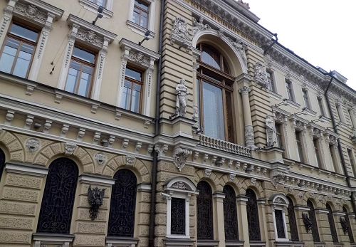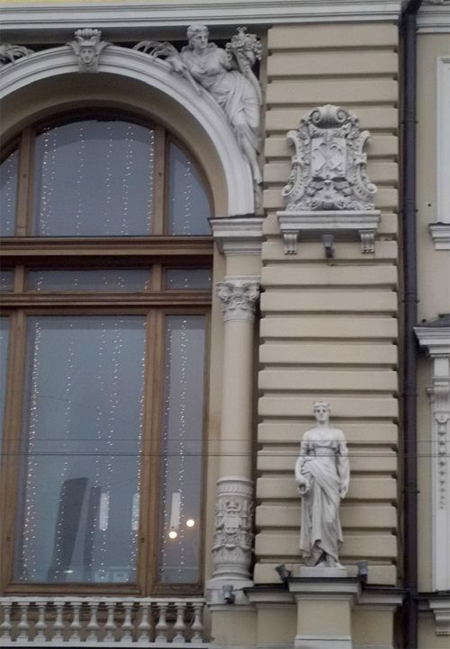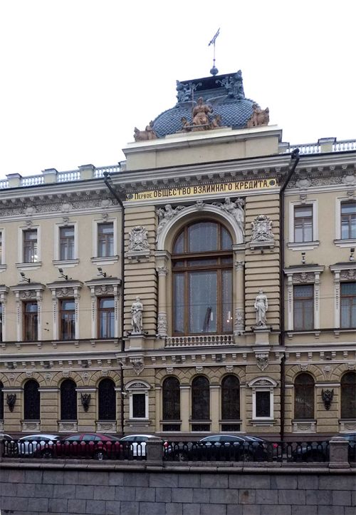 В здании Общества взаимного кредита на набережной Екатерининского канала архитектор Сюзор соединил ренессансные и барочные мотивы. Статуи создали скульпторы Иенсен и Опекушин. Скульптурное убранство в стиле триумфальной арки охватывает второй и третий этажи. У основания пилонов находятся две аллегорические статуи. Над ними находятся рельефные композиции, а над изгибом архивольта — горельефные изображения крылатых Гениев и Слав. Над аттиком высится многофигурная декоративная композиция, фоном которой служит застеклённый купол. Скульптурная композиция в центре дополняется пластическим декором ризалитов, включающим парные фигуры кариатид, маски львов у окон первого этажа и многочисленные детали фриза.